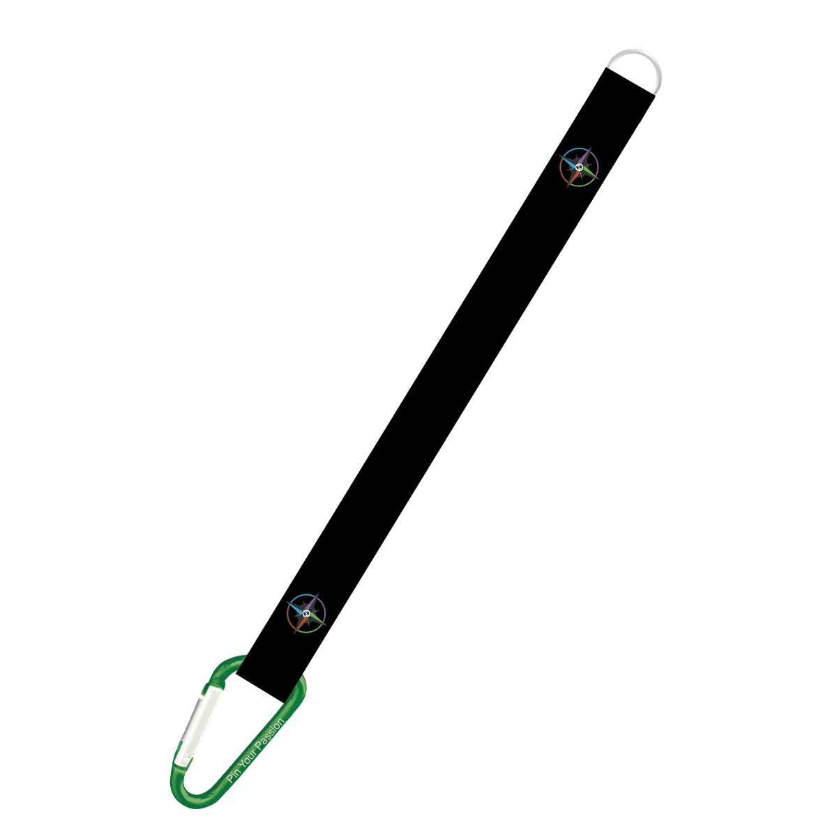 Karabijnhaak: groen met de tekst “Pin Your Passion”